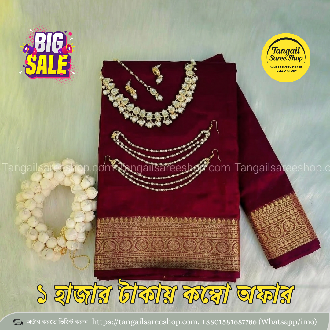 নিজেকে সাজাতে কিংবা প্রিয় মানুষকে উপহার দিতে এই বাজেট কম্বো প্যাকেজ হতে পারে দারুণ একটি পছন্দ। মাত্র ৯৯০ টাকায় পাচ্ছেন ১২ হাত শাড়ি, ব্লাউজ পিস এবং মানানসই জুয়েলারি সেটসহ সম্পূর্ণ সাজের আয়োজন। বাজেটের মধ্যে সুন্দর, পরিপাটি ও আকর্ষণীয় লুকের জন্য এটি একটি চমৎকার অফার।
